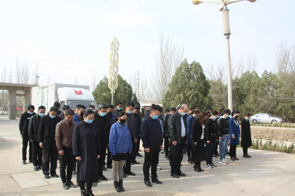 44上午10时,雅盐化集团公司在办公楼门前举行哀悼活动,公司所有升国旗场所全部下半旗致哀,公司在家领导、中层管理人员及员工共50余人集体默哀三分钟,汽车鸣笛,为新冠肺炎疫情斗争牺牲烈士和逝世同胞哀悼,为生者祈福。集团公司工会主席张菊萍主持哀悼活动。